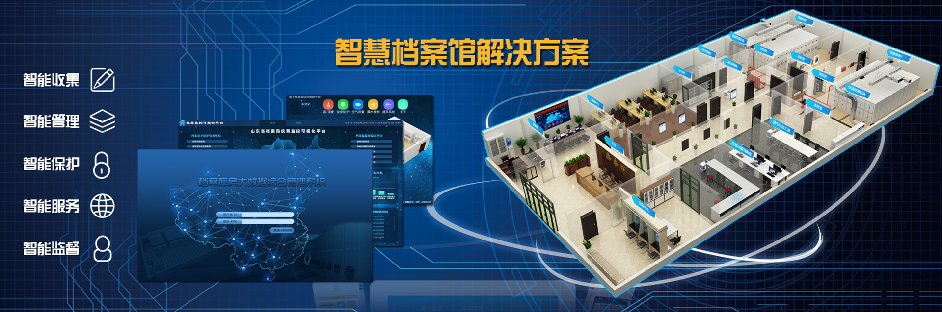 國韻作為山東省檔案庫房智能化綜合管理系統建設的龍頭企業,為濱州市市政府設計并建設了一整套檔案庫房智能化綜合管理系統,該系統將溫濕度自動測控、智能防火、智能防盜、消毒滅菌、漏水檢測、通風換氣、照明測控、視頻監控、門禁管理、防鼠防蟲、有毒氣體檢測顯示系統等集成于統一管理平臺...
